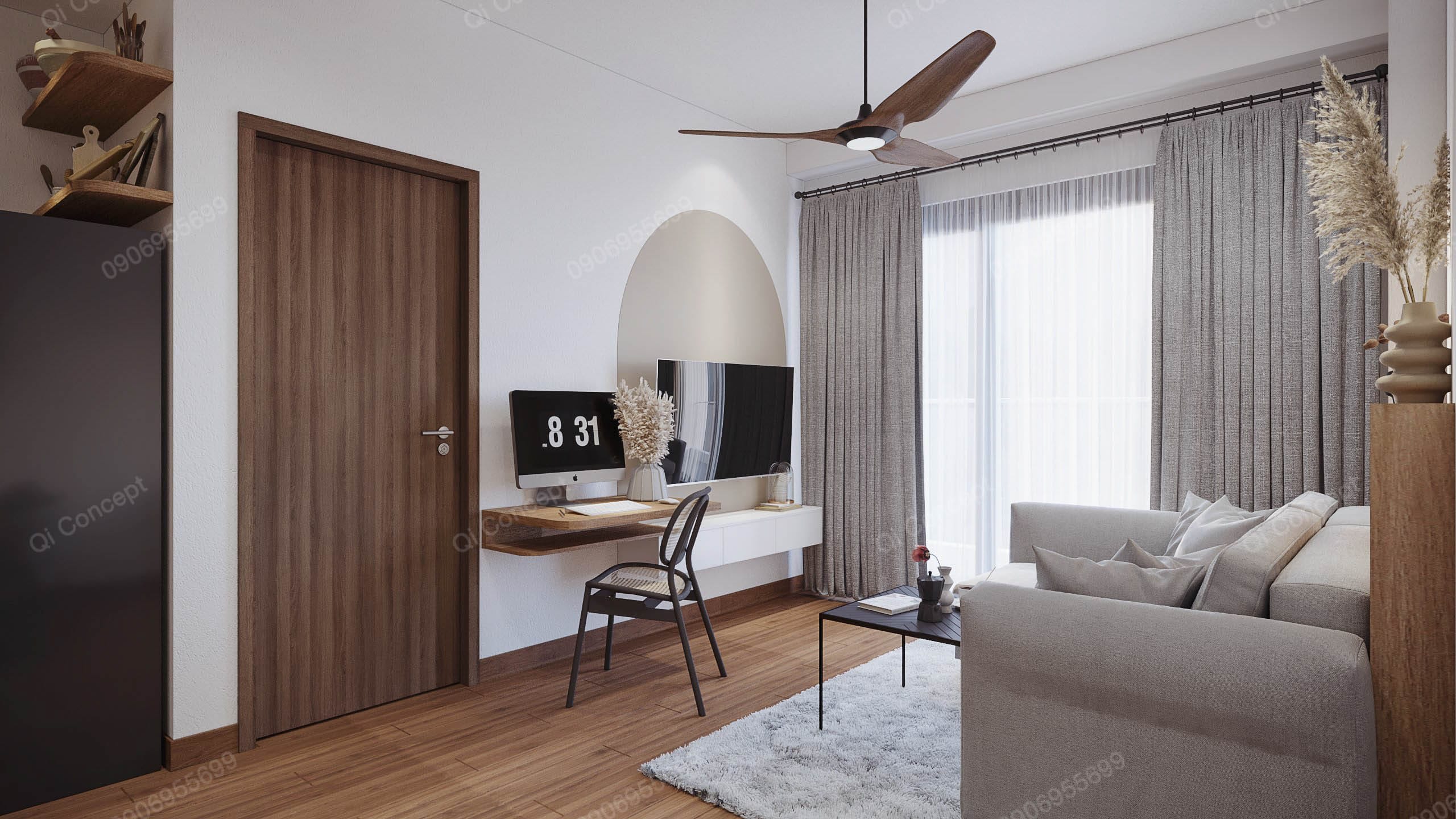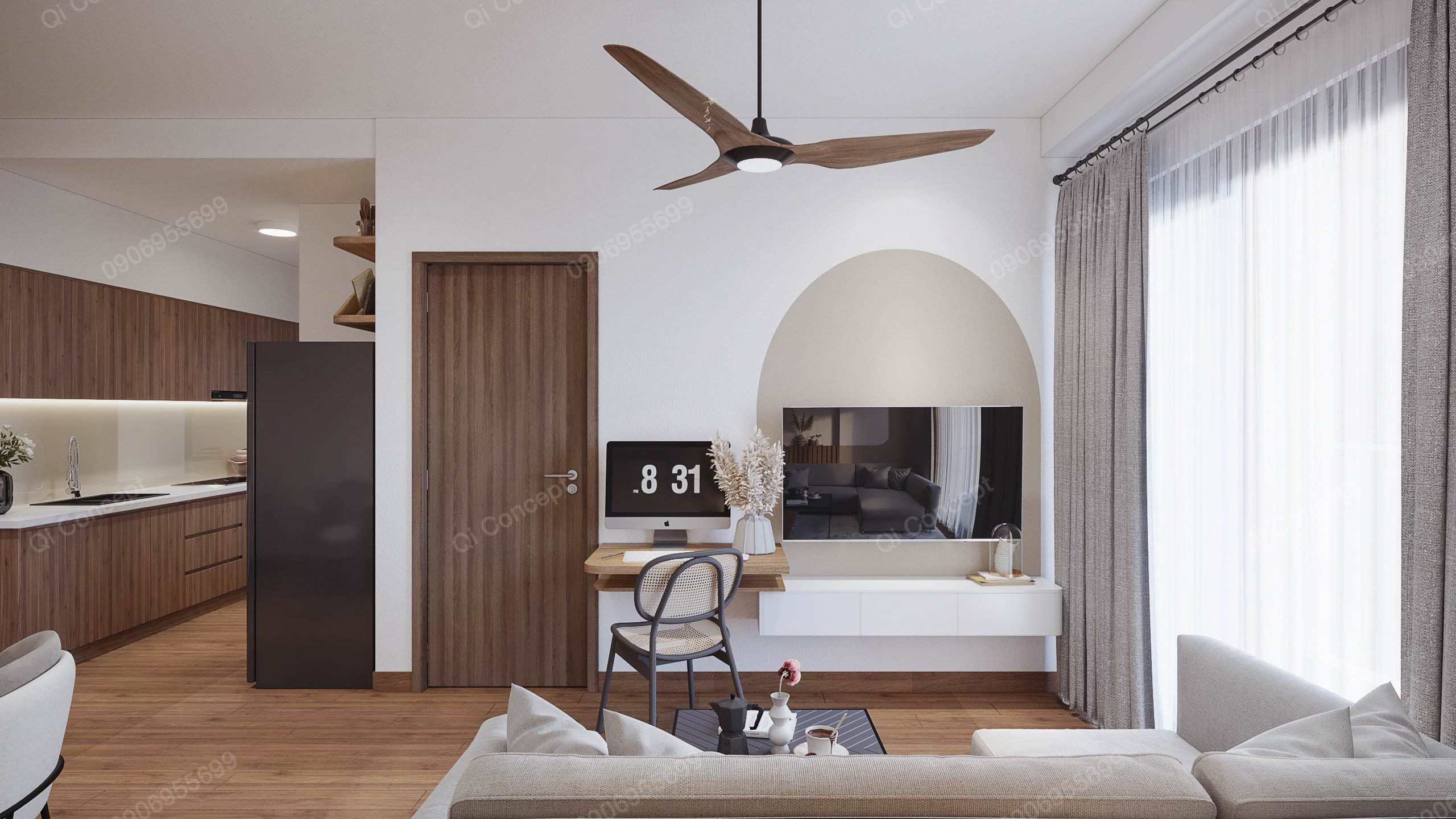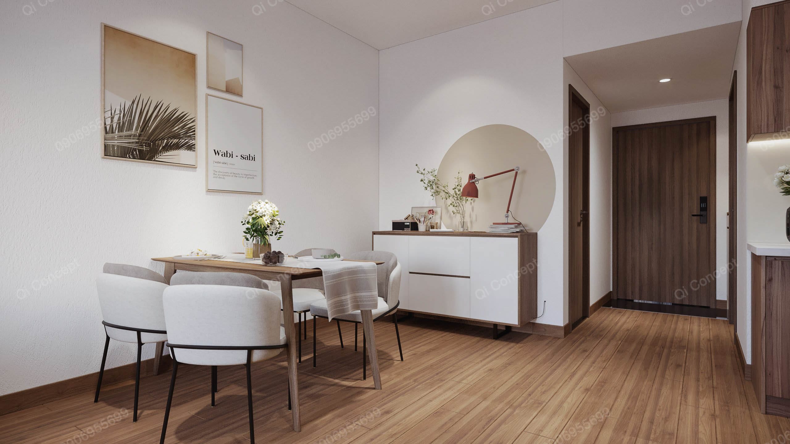 Căn hộ mặt bằng Akari City này có mức đầu tư không lớn. Gia chủ muốn tối đa ngân sách nhất có thể nên tận dụng một số đồ dùng nội thất có sẵn. Để tạo tổng thể hài hoà cho không gian, các KTS Qi Concept chọn phong cách thiết kế Japandi. Nội thất được sử dụng với tone gỗ và trắng, kết hợp các mảng tường sơn nhấn màu begie.