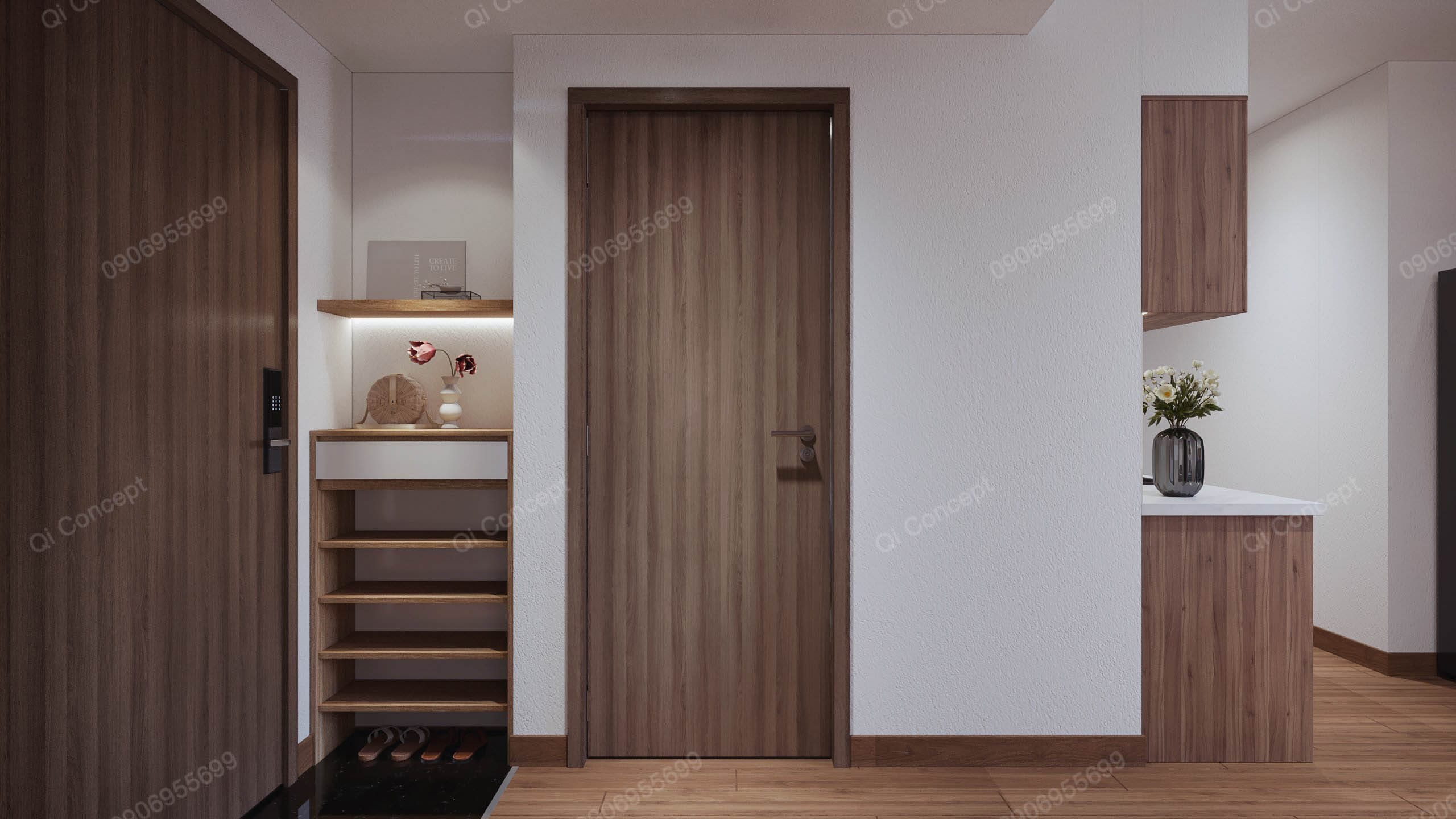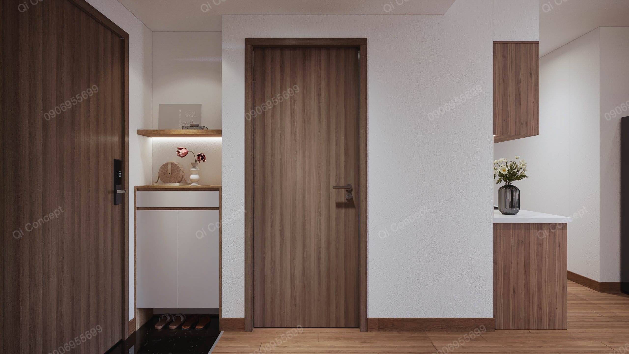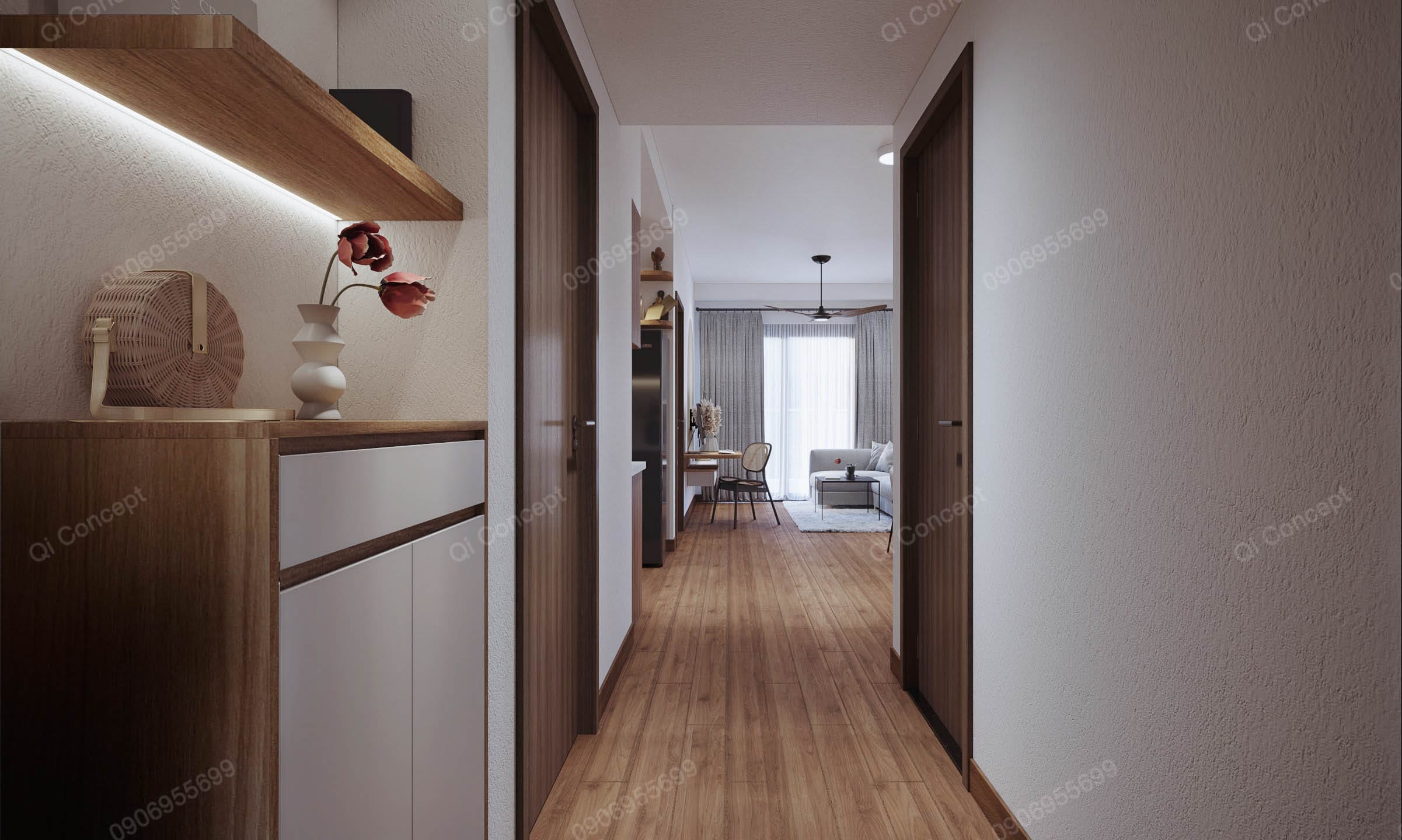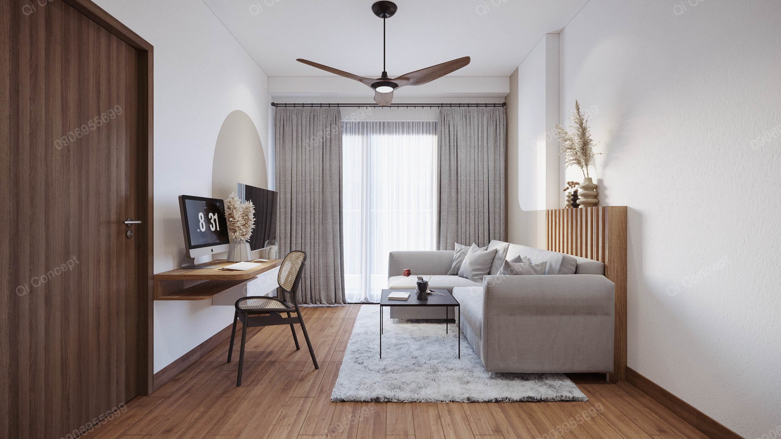 Căn hộ mặt bằng Akari City này có mức đầu tư không lớn. Gia chủ muốn tối đa ngân sách nhất có thể nên tận dụng một số đồ dùng nội thất có sẵn. Để tạo tổng thể hài hoà cho không gian, các KTS Qi Concept chọn phong cách thiết kế Japandi. Nội thất được sử dụng với tone gỗ và trắng, kết hợp các mảng tường sơn nhấn màu begie.