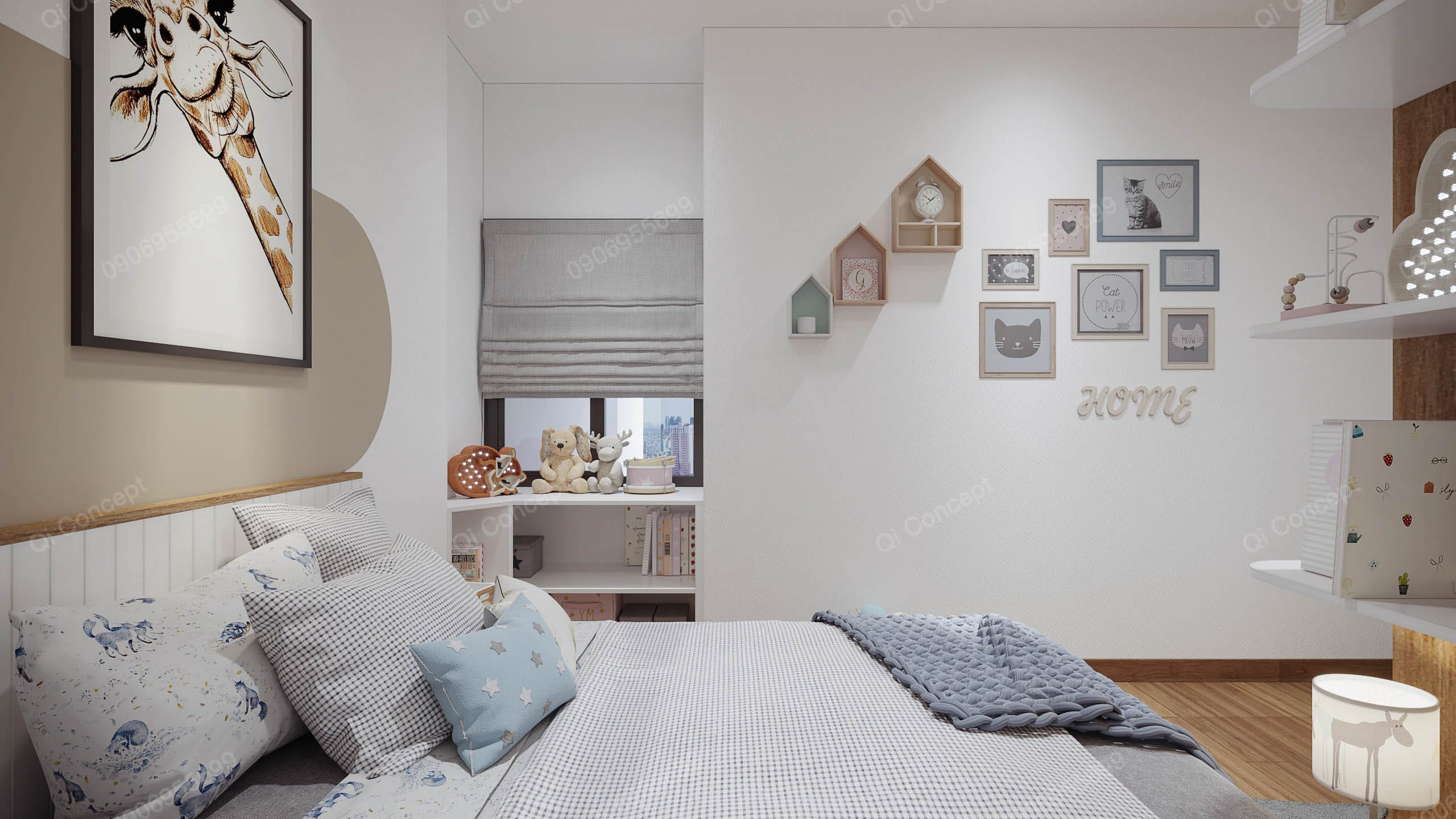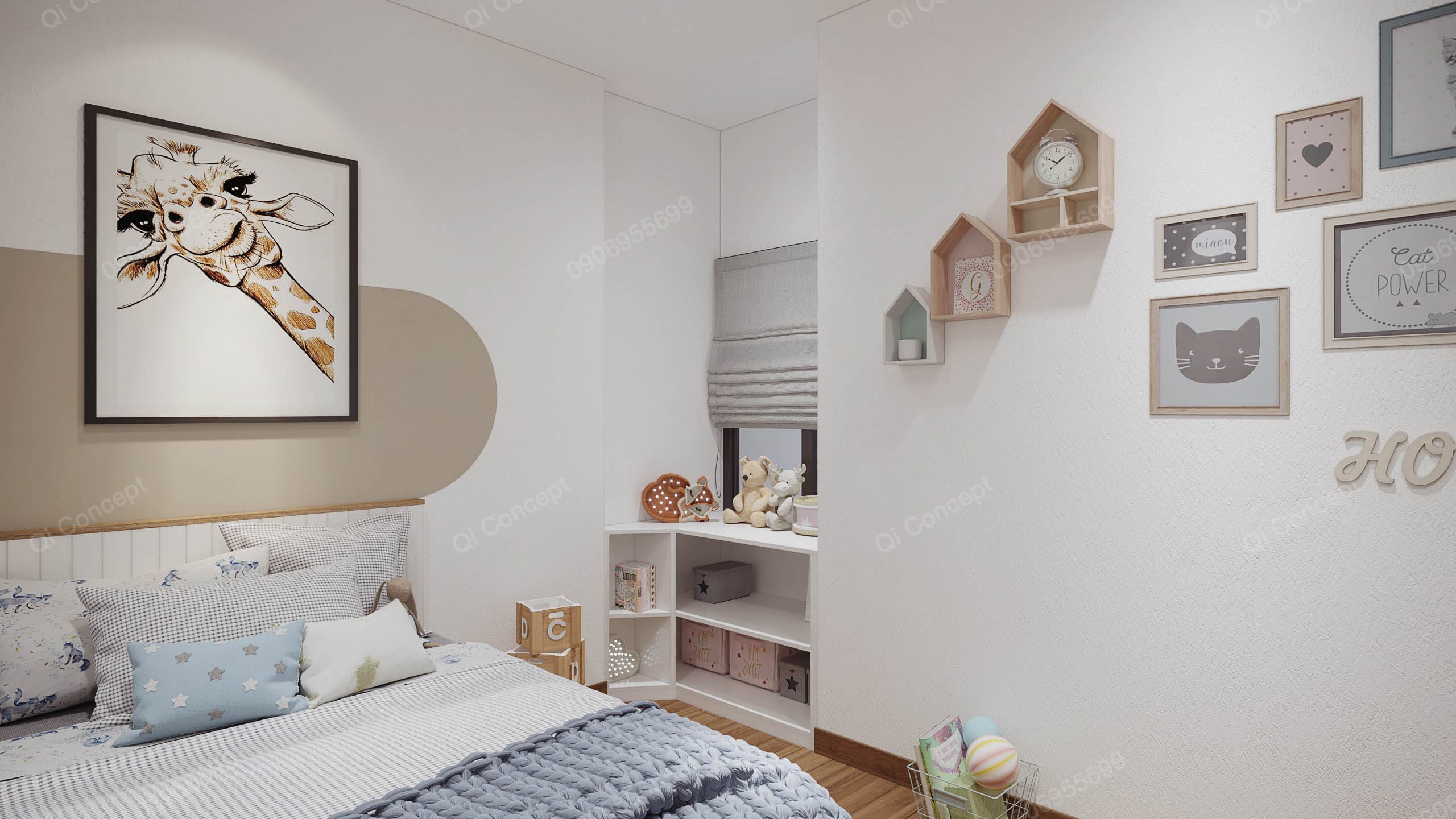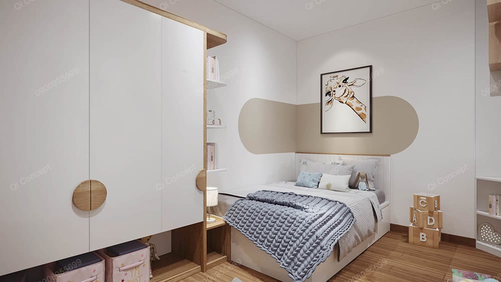 Không gian phòng ngủ phụ được thiết kế dành riêng cho con của gia chủ. Căn phòng sử dụng tone trắng làm chủ đạo, phối với màu beige rất hài hòa và trẻ trung. Công năng của nội thất cũng được các KTS Qi Concept chú trọng tạo nên sự tiện nghi tối đa. Việc sử dụng vật liệu gỗ MDF từ sàn nhà cho tới tủ quần áo, kệ sách, tạo cảm giác ấm áp cho bé.