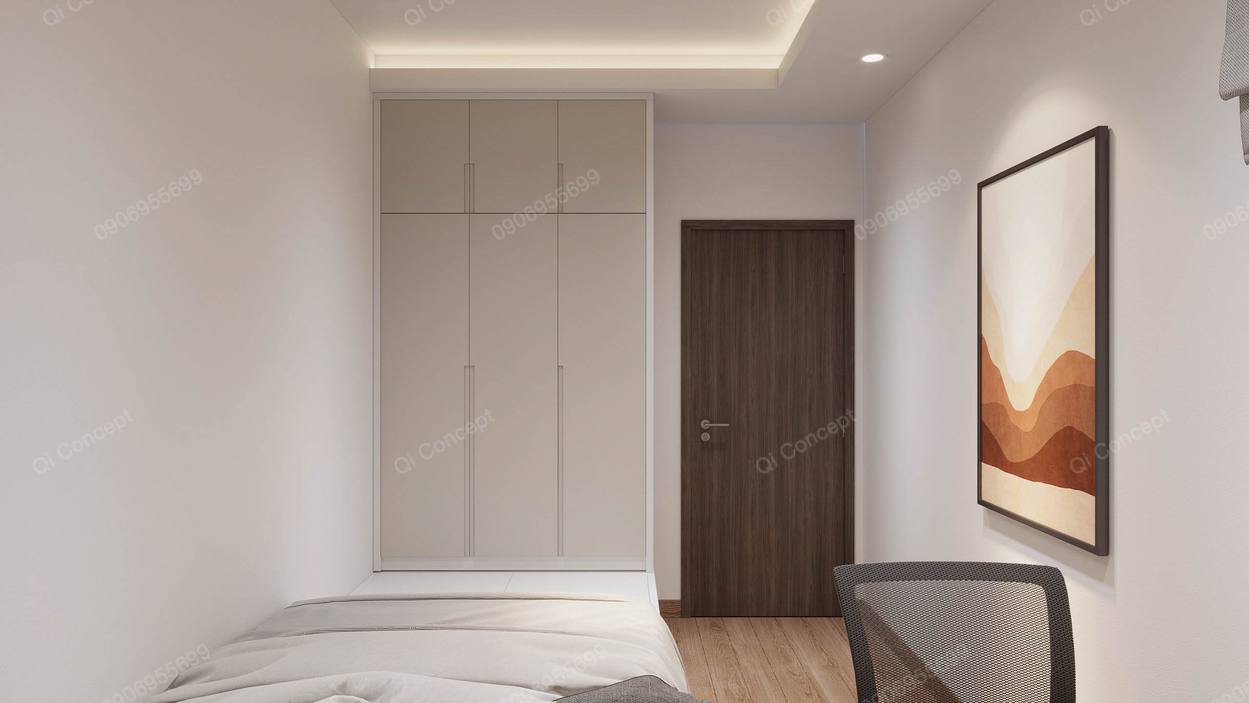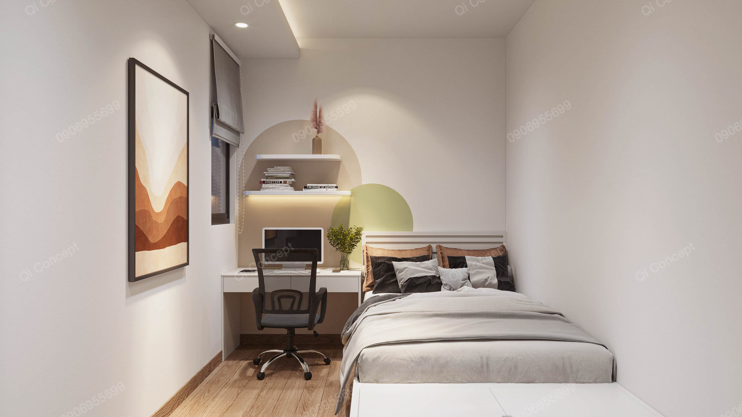 Phòng ngủ phụ tuy có diện tích nhỏ nhưng cũng được bố trí nội thất cơ bản tiện nghi. Mảng tường được tô điểm bằng khối sơn bo tròn làm điểm nhấn và đồng điệu với căn hộ.